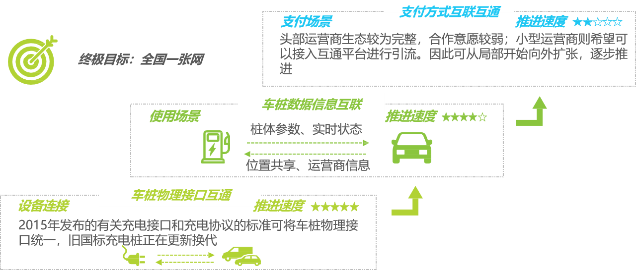 互联互通成为行业共识:由于利益分配问题支付互通短期内阻碍较大,行业实现电动汽车、充电桩、运营商三方之间的互联互通,可有效解决这一难题,通过信息数据的分析充分提高单桩充电设施的利用效率。
