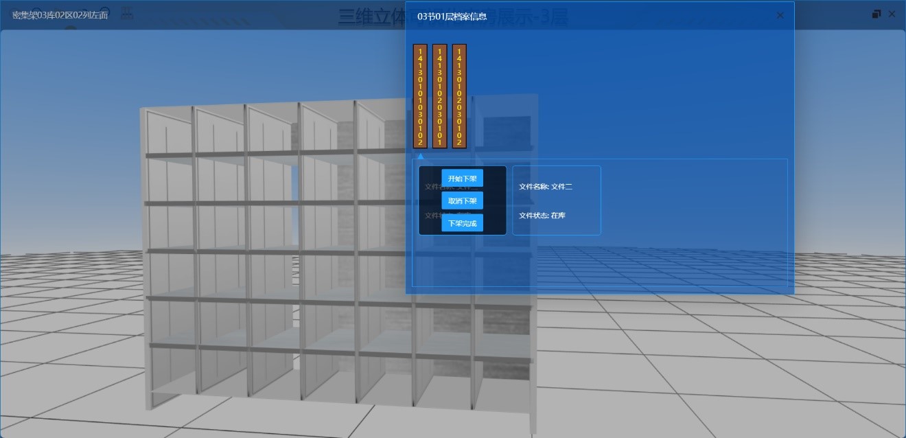本系统结合用户的深度业务逻辑,通过Three.Js三维可视化技术搭建数字孪生模型,使用IOT技术、运行历史数据,多尺度、多概率的仿真过程,在虚拟空间中完成映射,将真实设备与数字模型进行耦合交互,实现设备实时运行状态与数字孪生对象动作对应(支持密集架开启、关闭、查询文件等)。