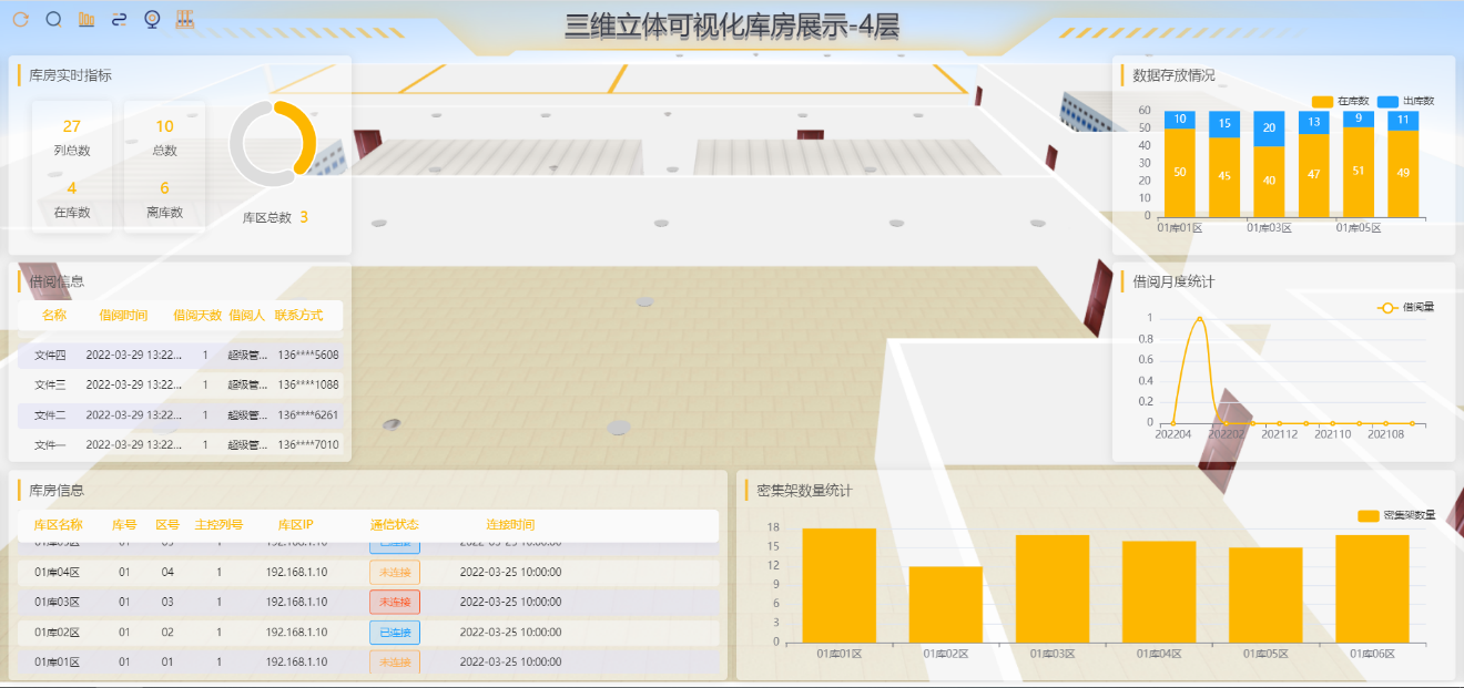 - 通过三维数字化库房,可实现业务数据查询,远程档案设备操作,全景环控系统设置,安全态势感知上报等功能,助力用户数字化转型。