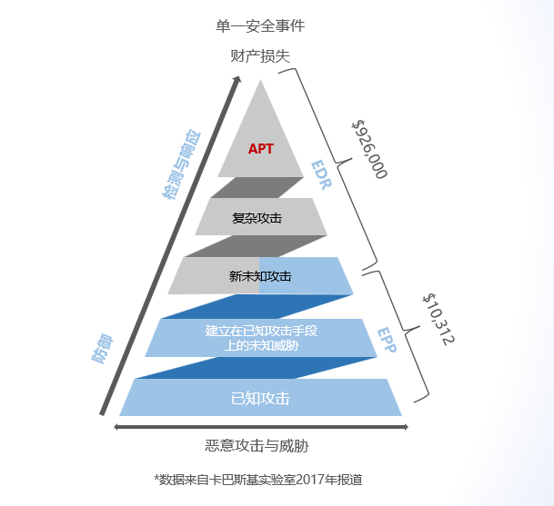 传统的端点安全防护主要是靠杀毒软件,通过病毒特征码匹配进行本地查杀,属于单机被动防御产品。之后的EPP(端点保护平台)虽然作为平台级端点主动防御解决方案并在企业广泛应用,但该产品还是采用了防御型技术,难以应对复杂攻击和高级威胁。随着终端泛在化,未来所有的网络节点都将是终端,端点安全的关注点,已经从单一安全防御转移到更注重威胁发现和自动化处置能力,对自动化威胁检测、响应、处理、运维能力要求越来越高。在此基础上,EDR应运而生。