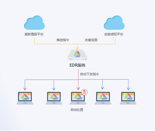平台针对安全风险较高的场景(如终端上报了高危安全事件,或触发了特殊的安全策略)可以快速响应并自动下发处置措施,及时阻断已知、未知或高级威胁,全面防护企业终端安全。