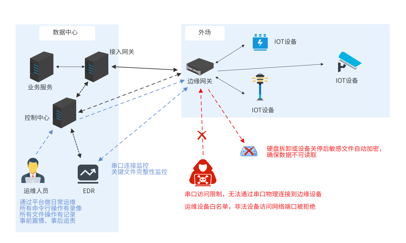 平台由边缘网关代理程序、网关离线运维工具、控制中心、接入网关、应用仓库等模块组合而成。产品核心功能包括边缘网关身份认证、网关出入站访问控制、网关间微隔离控制、边缘应用管理、网关安全运维、网关数据存储透明加解密等。同时平台保护网关与北向数据中心的访问安全,包括端口隐藏,通讯加密等。
